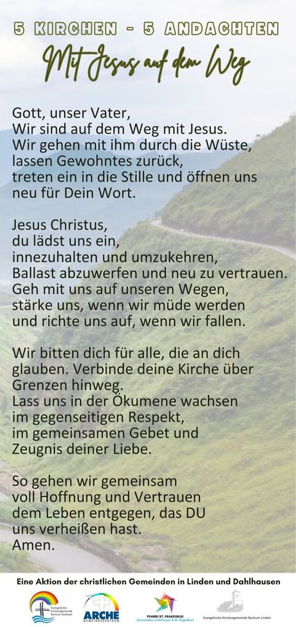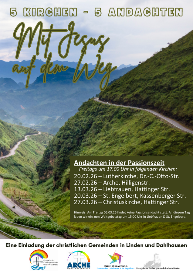 5 Kirchen - 5 Andachten. Unter dem Leitgedanken 'Mit Jesus auf dem Weg' laden die christlichen Gemeinden in Linden und Dahlhausen zu Passionsandachten ein.